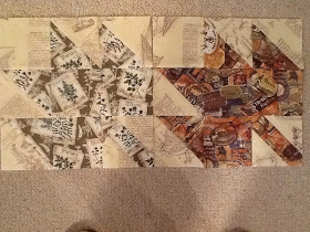 I have wanted to make a plus quilt forever. I had some fat quarters that I purchased at my LQS. Love them, great colours and fabulous combo. Cut out all the pieces and laid them out. Still in love.
